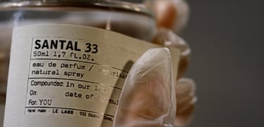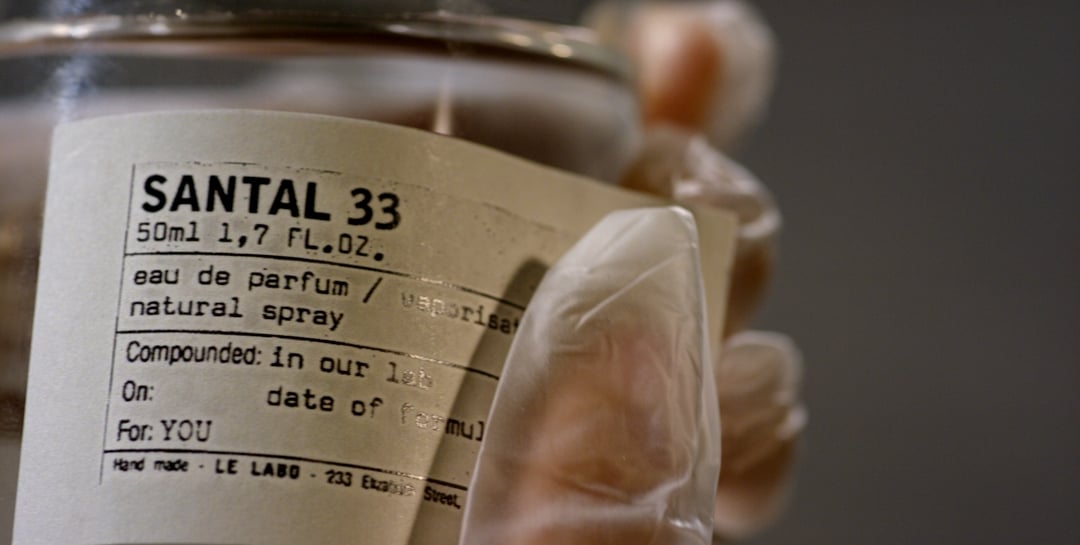 A lab lady collects the ingredients and apparatus to create a one-and-only bottle of "Santal 33" dedicated to her customer, dealt with care and delicacy.
